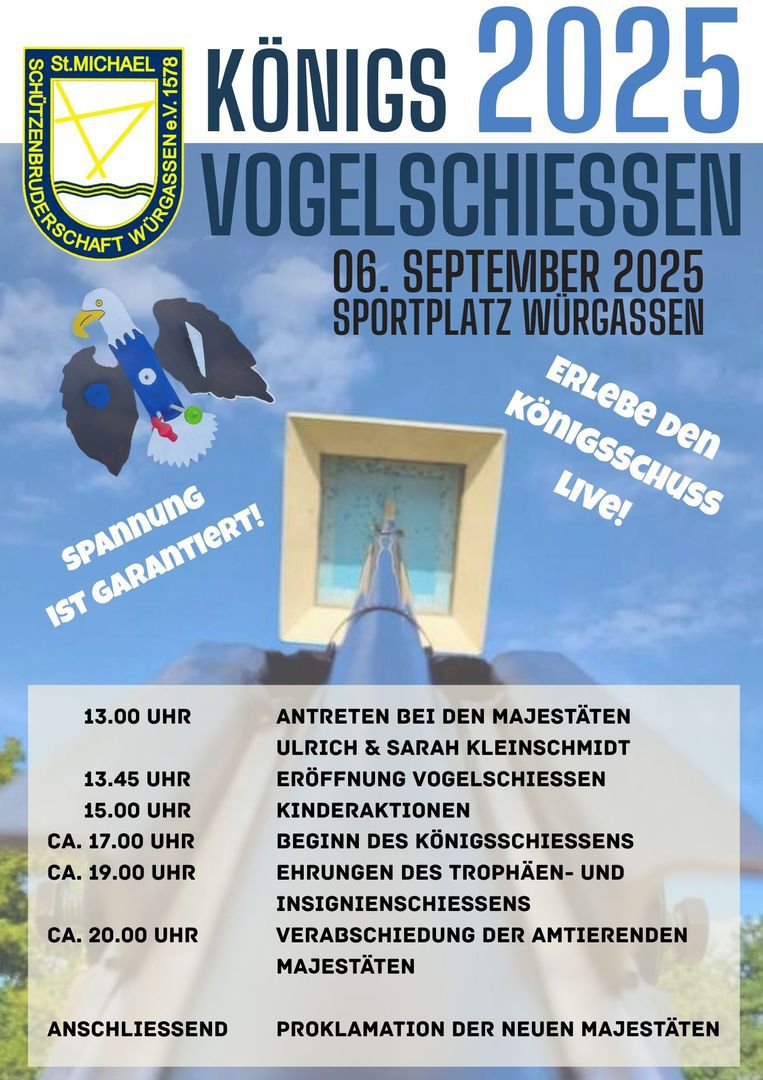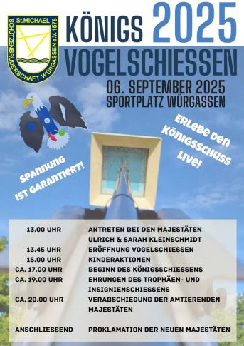 Der Ablauf verspricht Spannung pur: Um 13:00 Uhr treffen sich alle Würgasser Schützen zum Antreten bei König Uli Kleinschmidt. Ab 13:45 Uhr beginnt die Eröffnung des Vogelschießens mit dem