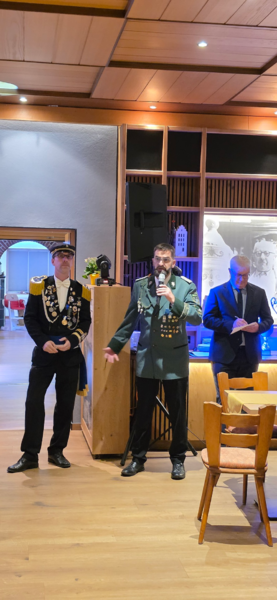 Neben Oberst, Major und General verließen der 2.Schriftführer Horst Kittler, Kassierer und Jugend-/Geräteoffizier Michael Kayser, Fahnenoffizier Florian Rüschoff, Fahnenoffizier Roland Kronenberg, Empfangsoffizier Thomas Kayser, Empfangsoffizier Gerhard Kloppenburg, Empfangsoffizier Peter Multhaup und Schießoffizier Dominik Drescher das Offizierscorps. Oberst Kleinschmidt verabschiedete jeden scheidenden Offizier mit einer Laudatio, bis nur noch er übrig blieb. Sodann ergriffen Major Dieter Riepe und General Wolfgang Wesserling das Wort und gingen ihrerseits auf den Werdegang von Oberst Jürgen Kleinschmidt ein.
