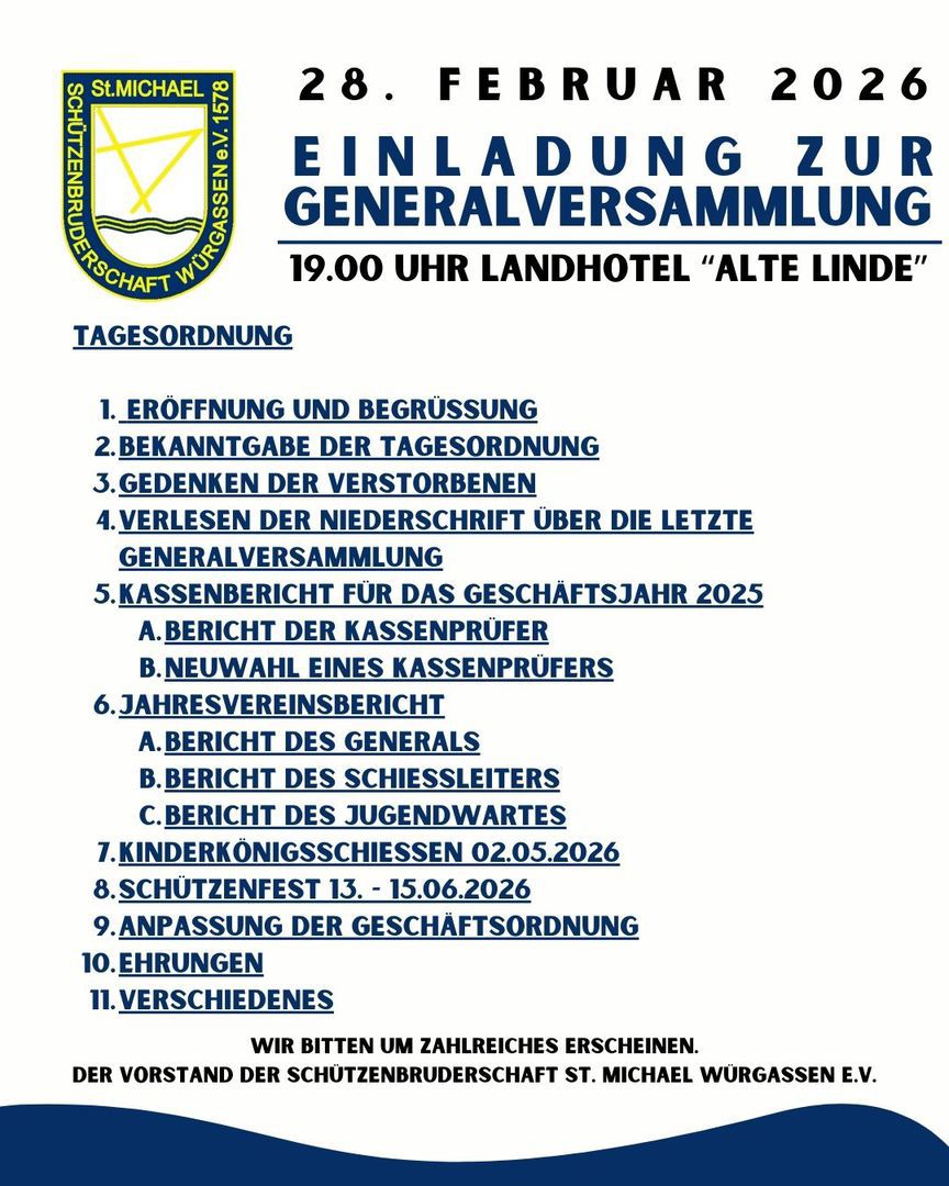 Die Schützenbruderschaft St. Michael Würgassen lädt alle Mitglieder zur diesjährigen Jahreshauptversammlung am Samstag, den 28. Februar 2026 ein.